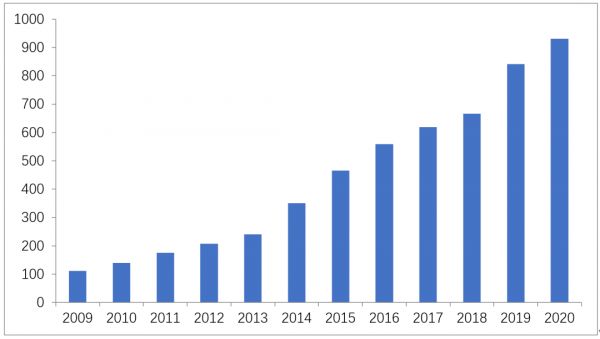既然有暴增的流量,那么一定有不断扩大规模的网络基础设施,只有坚强的网络基础设施才能支撑起流量暴增的需求。2010年,中国的移动通信基站数量不足140万个,到2020年移动通信基站数量已达到931万个,其中4G基站数量达到575万个,占据全球4G基站一半以上,有效支撑起过去几年移动互联网流量的暴增。