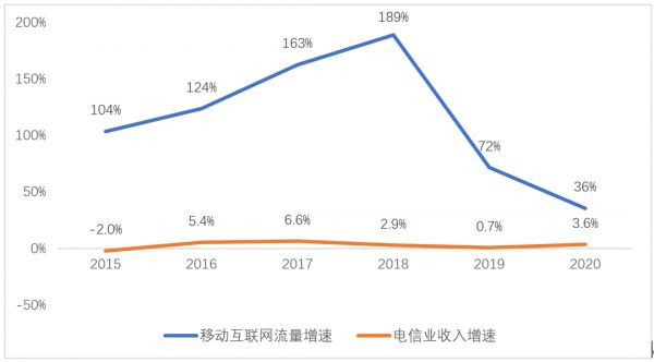 移动互联网接入流量和电信业务收入增速对比(来源:工信部)