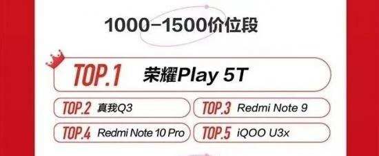 以分价位端单品累计销量来看,荣耀也仅仅只有一款荣耀Play5T在1000-1500价格段占据第一。