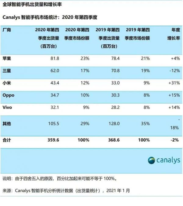 iPhone 12系列发布之初,有不少网友表示“十三香”,现在看来也并非如此。iPhone 12系列首销期间,就已经拿下了不错的成绩。Canalys 公布的报告显示,2020年Q4全球智能手机出货量达到了3.596亿部,同比下降2%。苹果在单个季度的iPhone出货量创下历史新高,以8180万部的出货量稳居第一,相比去年同期增长4%。