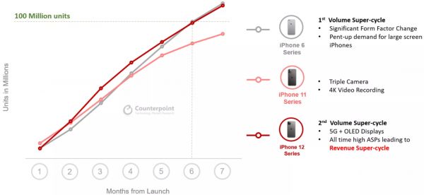 然而随着iPhone 12系列的发布,iPhone 6系列维持了将近7年的纪录却被追平。根据市场调研机构Counterpoint Research统计的数据,iPhone 12系列历时7个月全球累计销量突破1亿部,整体表现与iPhone 6系列持平。