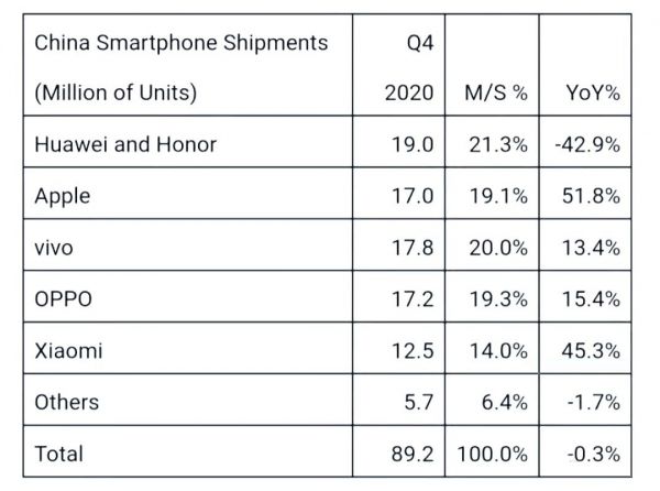 根据市场研究机构Strategic Analytics公布的数据,2020年Q4,苹果在中国手机市场的出货量达到了1700万部,同比增长51.8%。