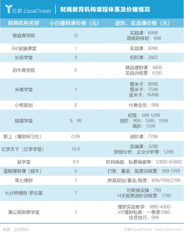 据亿欧EqualOcean调查,各财商教育机构对不同课程的定价存在一定差异,把各类课程组合包装为进阶课、以及办理会员卡是比较常见的方式,根据权限和教学内容的不同,最低几百块,最高可过万。