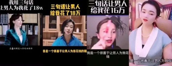再打开这些女人的其他视频,“三句话,让男人给我花了18万 ”、“如何轻松搞定高价值男人,一招让他主动送你礼物”等等,相同的文案,不同的面孔,看得人啼笑皆非。