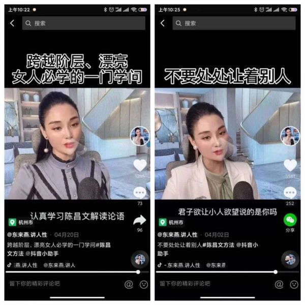 比如一个拥有近120万粉丝、名为“东来燕.讲人性”的账号,她的视频千篇一律,张口就是智慧的女人、牛逼的女人、优秀的女人、厉害的女人如何如何,以一种透视人性的口吻,时不时掺杂着名人语录(错别字都不忍直视),最后劝说观众跟随陈昌文解读论语。