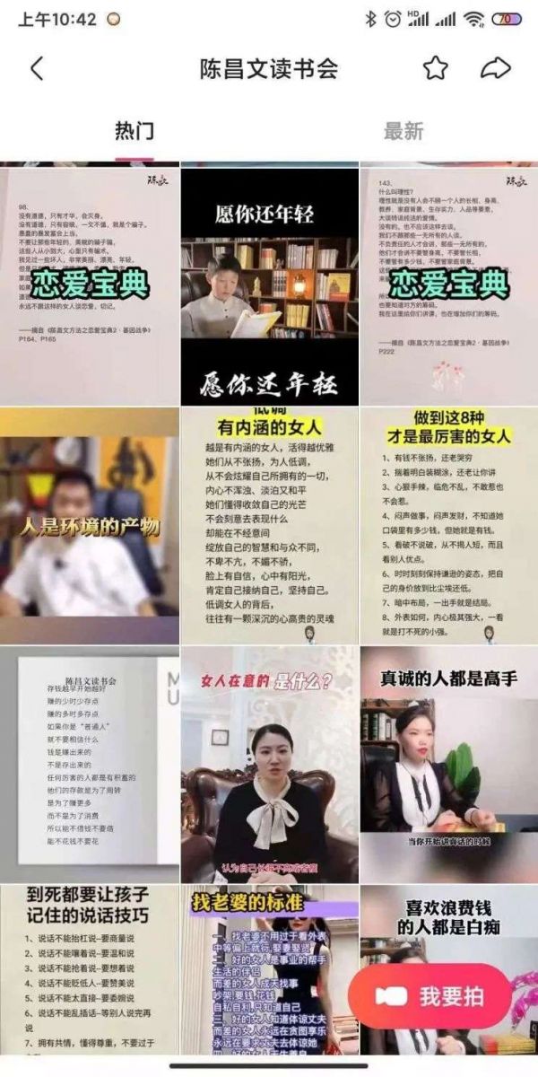 陈昌文在抖音、快手已然成了一个IP,不少人以“陈昌文社群内部讲师 ”、“陈昌文读书会”的名义授课或解说。仔细看这些视频,多是打着女性独立的旗号,宣扬所谓的女性智慧。