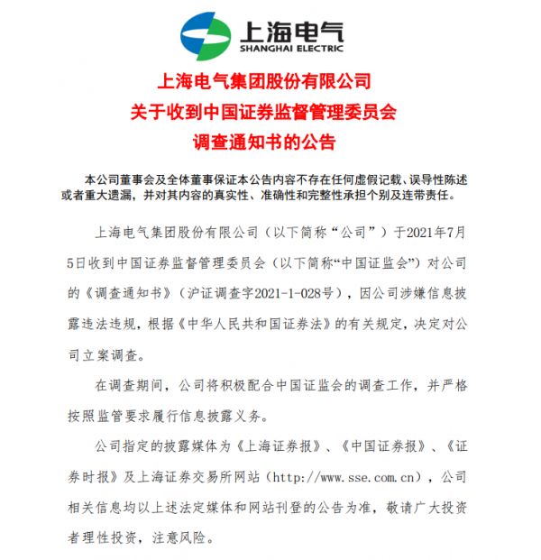 7月5日晚,上海电气发布关于收到中国证券监督管理委员会调查通知书的公告。