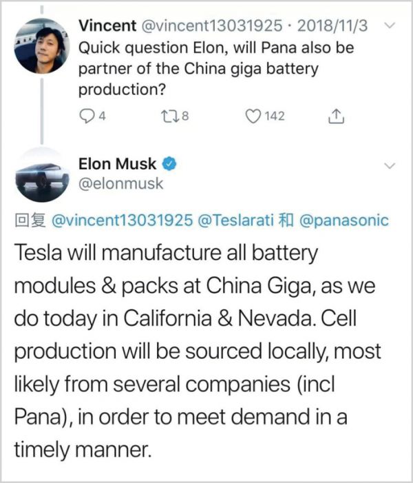 当被问及是否有意投资特斯拉计划在中国建设的工厂时,原松下CEO津贺一宏在财报会议上表示,公司“将优先考虑增加特斯拉超级工厂的产能”。而马斯克则通过推特表示,中国工厂的电芯将由包括松下在内的几家公司本土化供应。