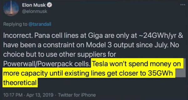 4月11日,外媒报道松下因财务原因将冻结超级工厂扩张产能的开支计划。马斯克于4月13日推特回应道“超级工厂的电芯产能只有24GWh,从7月份开始一直限制Model 3的产能,在产能到达35GWh之前,特斯拉不会再投钱进去。”