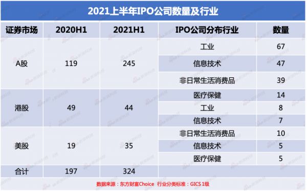 具体来看,2021年上半年,共有245家公司登陆A股,按照GICS行业分类,主要集中在工业(67家)、信息技术(47家)、非日常生活消费品(39家)和原材料(33家)几大行业。