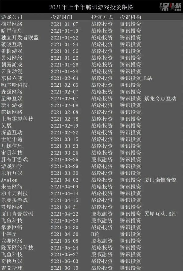 腾讯投资游戏公司的激进状态,到现在还让游戏行业投资人李伟印象深刻。“腾讯今年实在投得太多了”,2021年年初,他分析腾讯游戏投资策略,还能判断出它投资和关注的是此前不擅长的二次元、女性向、SLG(策略类游戏)品类,但现在他已经很难从中摸清规律,“不同阶段的公司、不管有没有过成功产品经验的公司,都在投”。