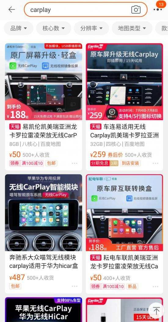 自然也不是用户,CarPlay在各个汽车论坛都备受好评,甚至成为消费选购车辆的重要加分项,许多车主在车辆出厂没有内置CarPlay系统的情况下,甚至选择自行加装,在多个电商平台可以看到用户对CarPlay的执着。