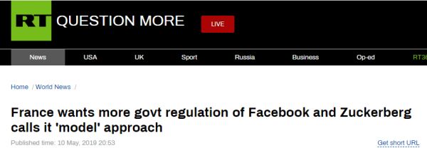 RT说,作为加强互联网监管的主要倡导者,法国总统马克龙10日会见了扎克伯格,二人就上述报告中的一些问题进行讨论。扎克伯格呼吁政府加强对互联网的监管,并称赞法国政府的做法是其他国家效仿的榜样。