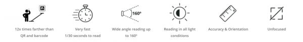 同时,彩色条形码的识别速度要比普通的条形码和QR码快12倍,只需要1/30秒就能完成识别,在无需对焦的情况下,能在160度的识别广度之下做到高精度。