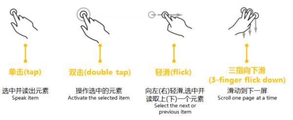 在苹果手机的“设置–通用–辅助功能”里,可以打开VoiceOver服务,开启后手机的交互手势将会发生变化。