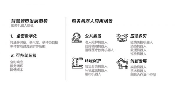 在政策、市场、社会需求和技术四轮驱动下,加之新冠疫情催生了无接触配送、社交距离监控、消毒机器人等众多新需求,种类、功能、形态繁多的服务机器人在智慧城市场景的应用已经成为新的趋势。