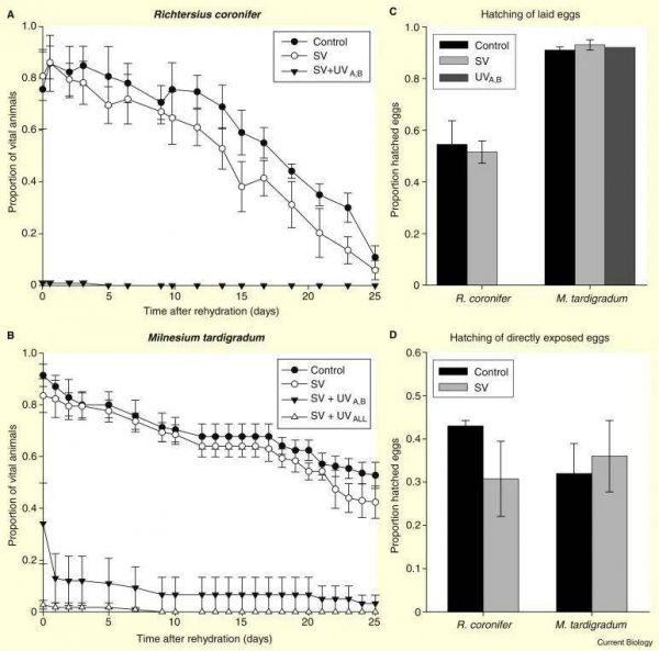 于是,在2007年欧洲的一次太空飞行中,两种水熊虫被带到了太空,并且暴露在不同的紫外辐射环境下。在最强烈的辐射环境中暴露30分钟后,虽然只有少数几只水熊虫存活了下来,但是这几只水熊虫产生的后代基本没受到什么影响。