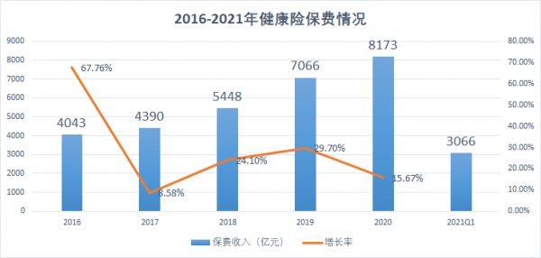 银保监会数据显示,2020年,健康险业务原保险保费收入8173亿元,同比增长15.7%,增速远高于其它各大类险种。在近5年,健康险年化增长率为31.4%,市场规模翻倍增长。今年第一季度,健康险原保费收入3066亿元,同比增长16%。按照增速预计,今年健康险行业将大概率突破万亿大关。