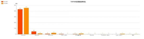 另外一个值得注意的趋势则是IBM Power系列处理器在超算领域中的衰落。虽然我们仍能再TOP10当中看到Summit、Sierra这样的顶级产品,但从23台到8台的占比也足以证明IBM和Power的式微。
