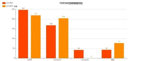 在2021年中的榜单当中,使用以太网进行互联的超算数量已经达到247台,无限接近50%。与之相对应的则是Infiniband这种传统高性能网络和各类定制网络占比的降低。