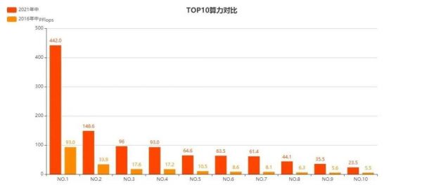 说明:2016榜单中算力33.9PFlops,排名第二的天河2号与2021榜单中算力33.5PFlops,排名第9的天河2A虽有血缘关系,但由于加速器从之前的Xeon Phi更换为Matrix 2000,因此,并不能认为他们是同一台超算。特此说明。