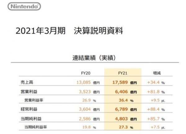 今年 5 月 6 日,任天堂发布了最新一期年报,报告显示,2021 年度(2020 年 4 月 1 日~2021 年 3月 31 日)总销售收入为 17589 亿日元(约 1042.4 亿元),同比增长 34.4%;总营业利润为 6406 亿日元(约 380 亿元),同比增长 81.8%,纯利润同比增长 85.7%。销量方面,Switch 累计卖出 8459 万台,较去年增长 37.1%,超过了一代经典 GBA 的 8150 万台。