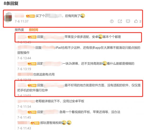 某网友购入一台安卓平板后在社交媒体上表示“买了个xx平板(安卓平板),后悔死我了”,并在其评论区解释了原因“苹果至少很多适配,安卓基本个个都是”“最不好用的地方就是软件方面,没有适配的软件,仅仅是把手机的软件强行拉伸”。