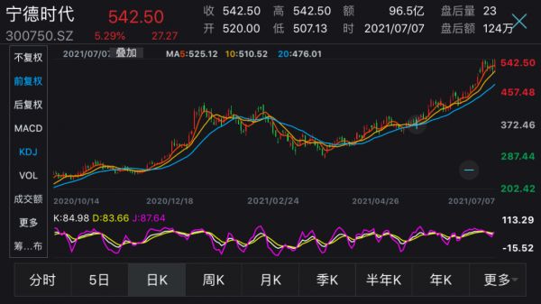 截至7月7日收盘,宁德时代上涨5.29%,报542.5元,创下历史新高,总市值达到1.26万亿元。
