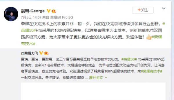 7月5日,荣耀CEO赵明转发了一条有关荣耀50pro快充技术的微博,并附文“荣耀在快充技术上的积累并非一朝一夕……欢迎体验!”该微博手机型号处显示为“荣耀50 Pro 5G”。