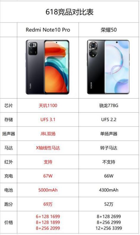 也有网友为了对比荣耀的参数,还放出了Redmi Note10 Pro与荣耀50的对比图: