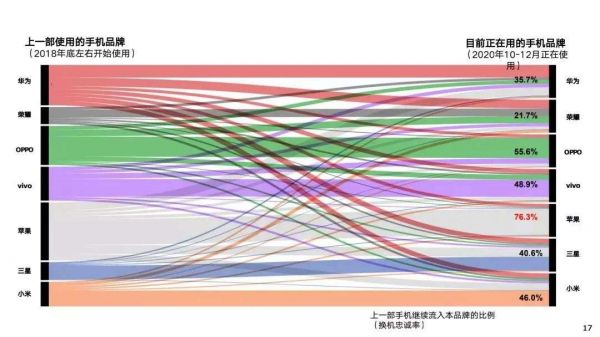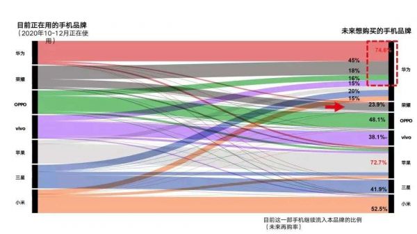 据中国移动终端实验室近期发布的《2020年第二期5G终端消费趋势报告》显示,在代表“换机忠诚率”指标,即从上一部手机到现有手机的品牌变化方面,荣耀仅为21.7%,在包括苹果、华为、三星、OV和小米在内的所有统计厂商中,排名垫底,且差距较大。例如与对手小米的46%相比,仅为前者的不到1/2。而在未来再购率指标上,荣耀同样仅以23.9%排名垫底。