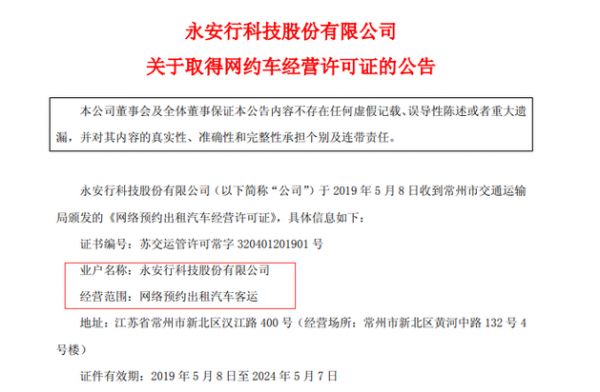 5月8日,永安行发布公告称,该司已取得网约车经营许可证。这家曾极为抵触“共享出行第一股”的公司,终于要在共享出行领域更进一步。这条公告中,有一句话格外显眼——“公司网约车经营具备全国范围内线上服务的能力”。