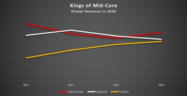 可从全球营收来看,2020年Suprecell跟莉莉丝营收虽略有下滑,但整体实力仍高于FunPlus。