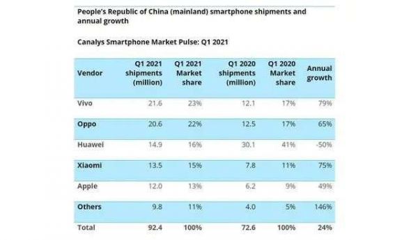 Canalys公布的2021年第一季度国内智能手机报告数据显示,OV分别以同比增长79%和65%拿下国内前二的名次,小米虽说同比增长达到了较高的75%,但出货量却只有1350万台,相比OV少了近700万台。