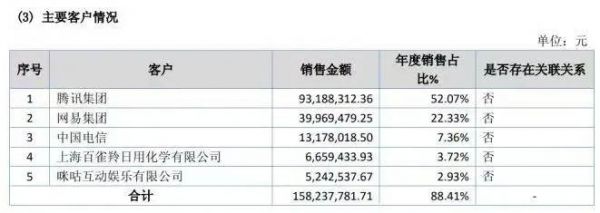 所以在股东阵容和业务展开层面,网映文化抱上了网易和腾讯这两条大腿,成为其营收的最大来源。2020年的财报资料显示,腾讯和网易分别是网映文化的第一、第二大客户,两者合计产生的费用占营业收入比高达74.4%;2018年和2019年这一数据分别为89.4%和65.4%。