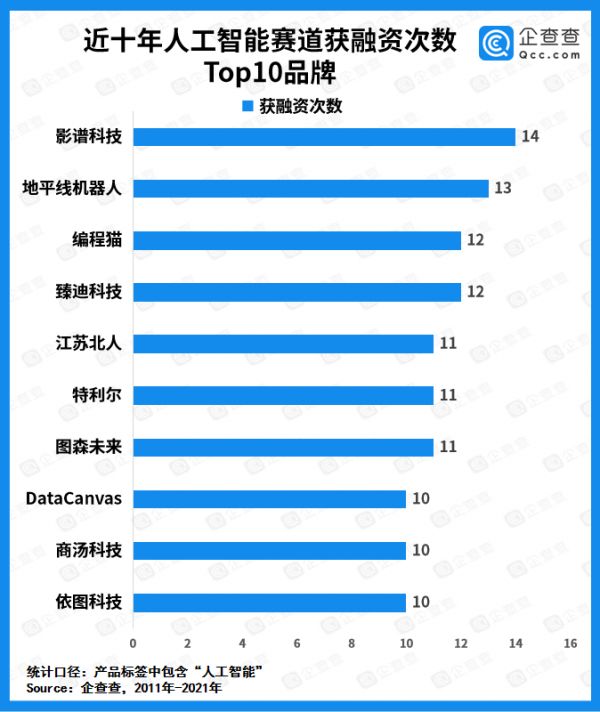 作为国内领先的智能影像生产技术商,“影谱科技”自2011年以来共计获得14起融资,总金额超304亿元人民币;其次是边缘人工智能芯片的全球领导者“地平线机器人”,共计获得13起融资,总金额超225.6亿元人民币;并列排第三的是“编程猫”和“臻迪科技”,二者均获得12起融资。