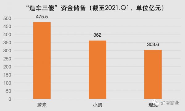 其实短期来看,三家新造车公司的账上都不缺钱。截至今年一季度末,蔚来、小鹏和理想的资金储备分别为:475.5亿元,362亿元、303.6亿元。