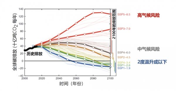 历史的碳排放在图中用黑线标出了,可以看到,在过去百年,我们人类排放到大气中碳已经相当多了。如果按照这个趋势继续向上递增,很有可能会按照上图中红色曲线的走势发展。若是如此,我们未来将要面对的温升将会达到7℃~8℃。