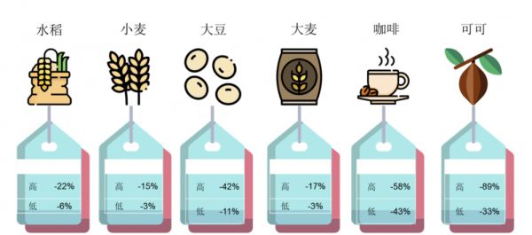 副食品受到的影响就更明显了,拿咖啡和巧克力来说,高气候风险会造成它们的产量下降60%~90%。夸张点说,也许未来情侣间互送一块巧克力的情谊真的可以和送钻戒相媲美了。
