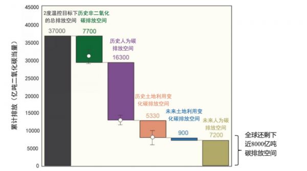 为了回答这个问题,我们要给碳算算账。如果以2℃温升来举例,我们一共可以向大气里面排放大约37000亿吨碳。这听起来好像还有很多的。但经过计算,我们全球,还剩下大约8000亿吨碳的碳空间了。