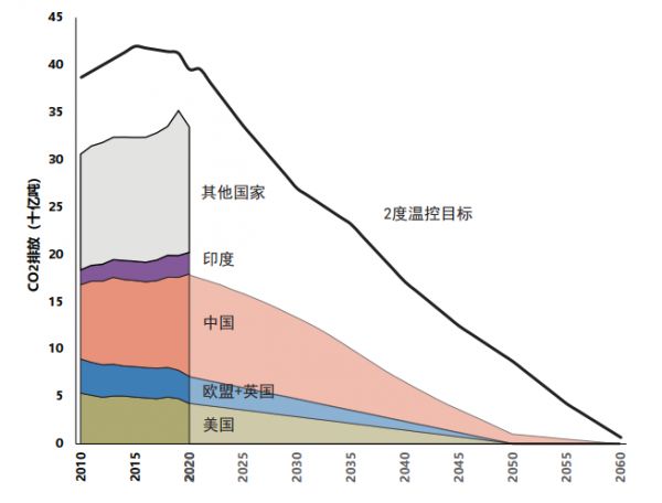 以全球4个重要经济体为例,从2010年开始到现在,美国、欧盟、中国和印度已经排放了上图这么多碳。未来包括我们国家在内的一些国家承诺了碳中和,那剩下这么多空间(图中黑色粗线下方的白色区域),那是应该分给印度、南非、巴西,还是埃塞俄比亚或越南呢?