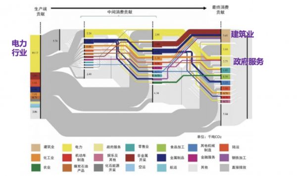 电力行业贡献了全球近一半的二氧化碳排放,但其产出主要是为了生产加工其他产品,比如说钢筋、水泥等。这些建筑材料主要是为了满足建设需求。到了消费端,建筑业和政府服务就是最大的行业碳排放贡献者了。消费端的碳排放对拉动整个生产链的碳排放都是巨大的。