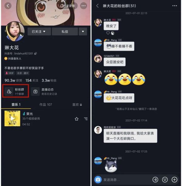 2021年3月,抖音内测“粉丝群聊”功能(现已正式上线),直接显示在账号主页界面内,群主可设置粉丝入群门槛。