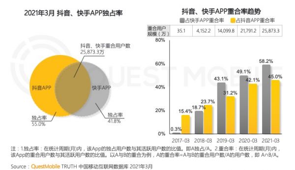 首先,抖音需要寻找新的用户突破口。在“南抖音北快手”两大短视频平台巨头不变的局面下,抖音的用户规模虽然一直处于领跑状态,但两者之间的重合用户数却是逐年增加,这意味着抖音与快手的用户争夺战已经进入白热化阶段。