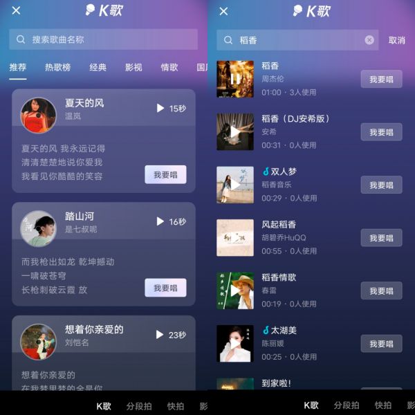2021年6月,抖音内测“K歌”功能。入口位于App内下方导航栏的“+”号中,在部分短视频的音乐链接处也会有“K歌”的入口。