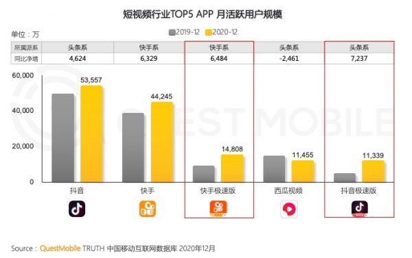 据QuestMobile《2020中国移动互联网年度大报告》显示,抖音去年的月活跃用户规模增长速度是低于快手的。再加上微信视频号、B站等平台不断侵蚀短视频领域,即将到来的用户增量天花板几乎可以让抖音如坐针毡、如芒在背、如鲠在喉。