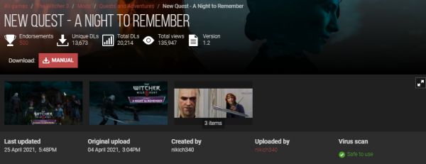 这样的 Mod在《巫师3》圈子里前所未有,立刻吸引了大批玩家的关注。在下载网站 Nexus Mods 上,这个任务包已经被浏览了超过13万次,总计下载量超过2万次。