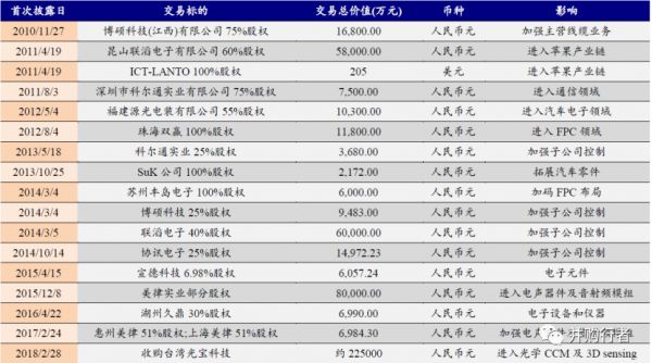 l 2016年、2017年为了切入声学领域及苹果声学供应链,控股苏州美特、上海及惠州美律;2018年为切入光学领域,收购光宝摄像头事业部;