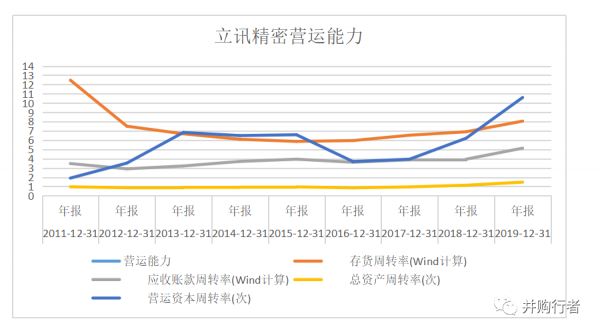 从下图,我们可以看出经过多年的并购,立讯精密的总资产周转率、存货周转率、营运资本周转率、营运资本周转率都呈上升趋势,在被并购标的资产营运效率相比立讯精密来说要低的情况下,可见并购的整合使得被并购标的的运营效率得到很大的提高,