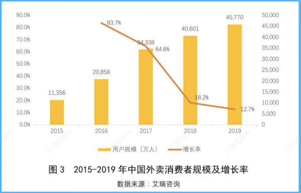 艾瑞咨询调查数据显示,2019年中国餐饮外卖产业规模为6536亿元,相比2018年增长39.3%。与此同时,外卖产业的渗透率也继续提升,2019年全年外卖产业渗透率达到14.0%,相比2018年的11.0%提升了3个百分点。截至2019年年底,中国外卖消费者规模约4.6亿人,相比2018年年底增长12.7%,在9亿网民中的占比约为50.7%。